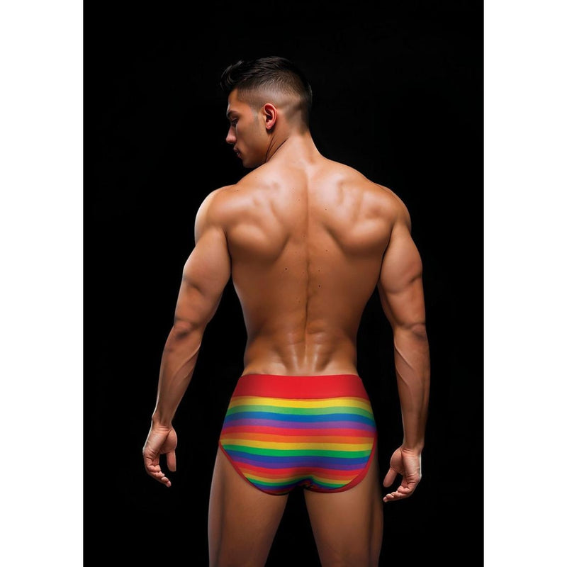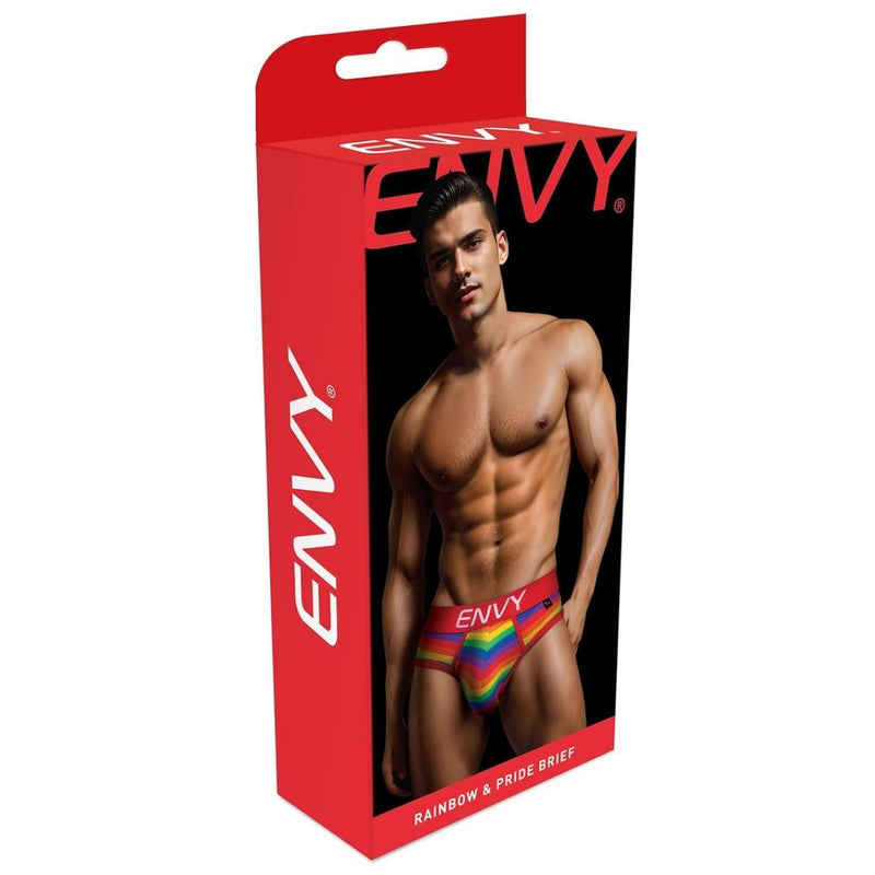 Envy Men's Rainbow Pride Briefs: the epitome of comfort and style. Made from a blend of cotton and spandex, these briefs offer a perfect balance of softness and flexibility. With a vibrant rainbow pattern on both the front and back, they add a playful pop of color to your wardrobe. Designed for all-day comfort, they feature a snug yet flexible fit and premium-quality fabric for breathability. The bold red waistband, adorned with the Envy logo, adds a touch of sophistication to this statement piece.
