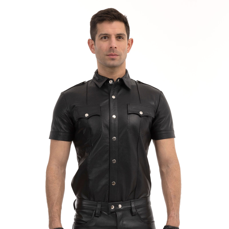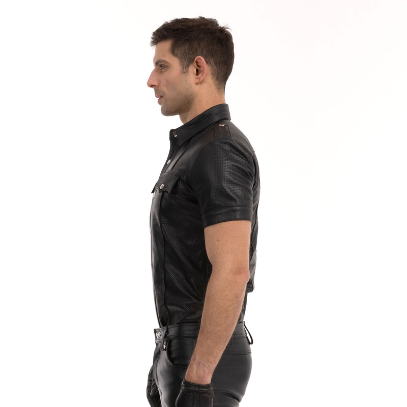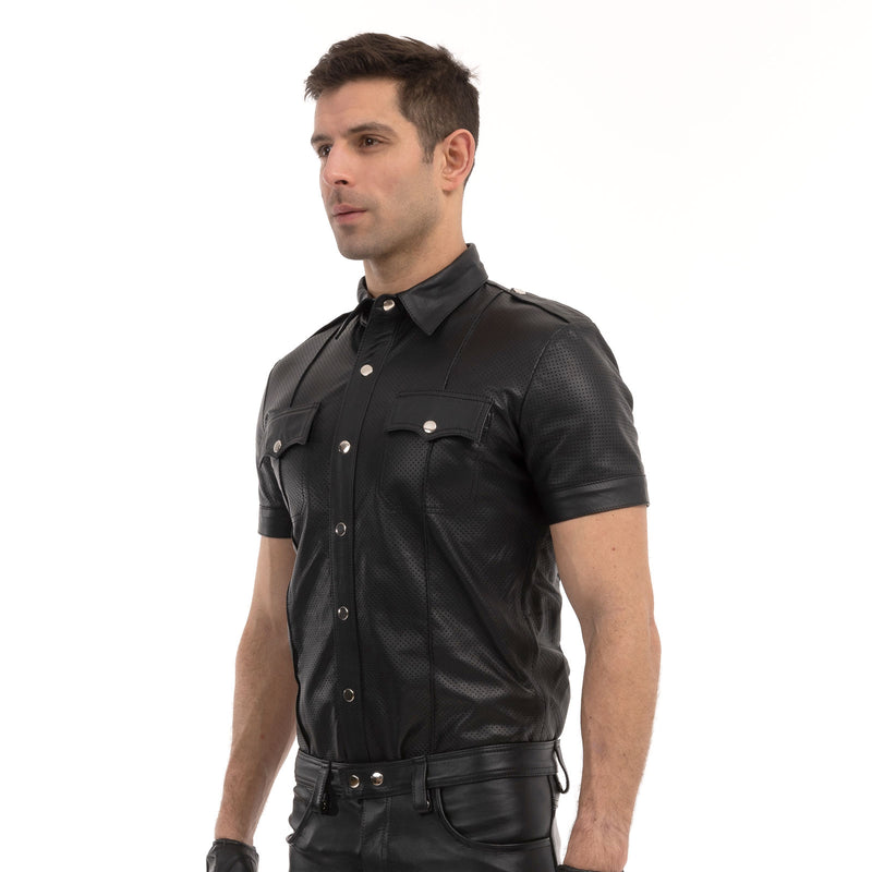 The Prowler RED Punch Hole Shirt is a smart and fitted leather shirt with small discreet punch holes across the material, making it both breathable and sexy to wear.