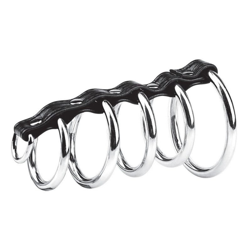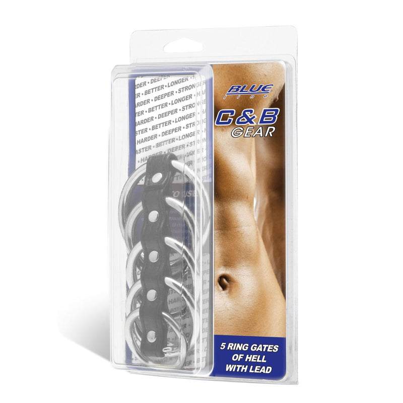 Do you dare to wear the 5 ring Gates of Hell from Blue Line, a great way to keep your package locked up. The unique design is made of a series of metal rings attached by a single strap. The largest ring sits at your perineum, and the 4 balance rings secure your cock. This cock ring also features an attached D-ring, perfect for use with a leash for sub play.