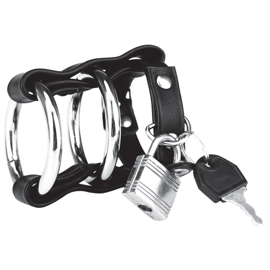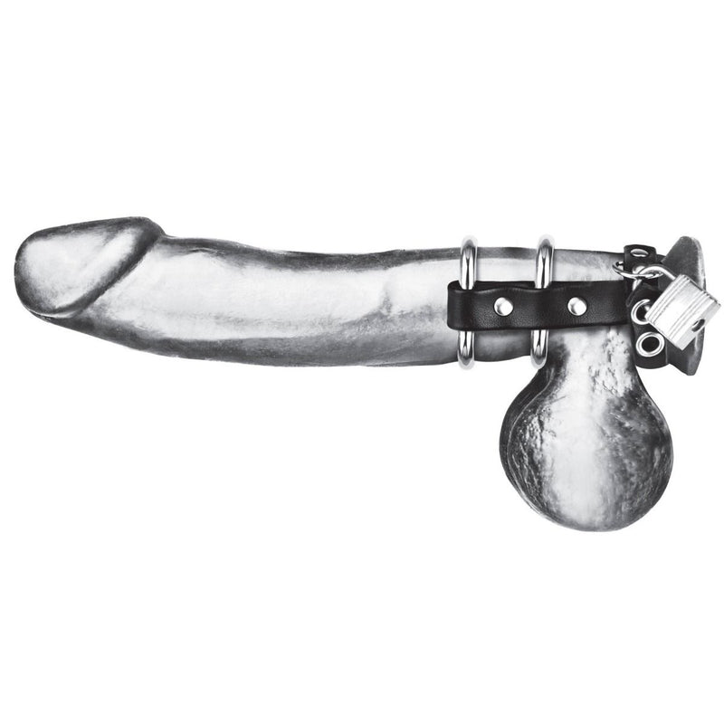 Slip your cock through the metal rings and wrap the leather strap around the base of your cock and balls. Slip the lock through the grommets and lock yourself up. Just remember, don't lose the key!