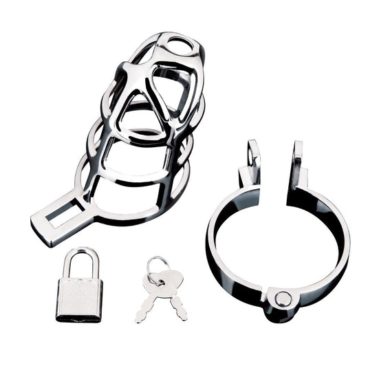 With a high-quality design, the Enslave Cock Cage by Blue Line is the ultimate Chasity device for keeping your member on lockdown. Made from stainless steel the ultimate Cock Tease Cage offers you and a penis owner a simple design that is easy to put on but not so easy to get off without your dominant’s permission. The cage fully surrounds the shaft in a metal cage like design with a hole left at the tip to allow for urination. To get them locked up, first use a water-based lubricant around the non-erect penis and scrotum. Next you can gently pinch the skin of the scrotum and pull through the ring, pulling through one testicle at a time. Next bend the penis down and put the shaft through the chastity cage. Lock securely in place and keep the key in a safe place. Comes with two keys.