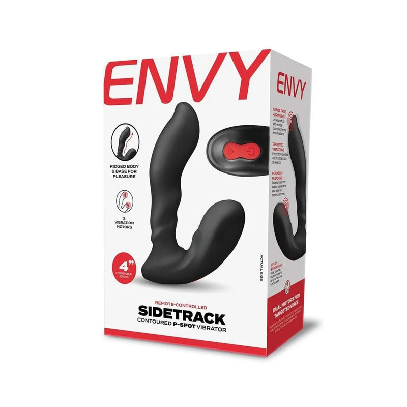Lose track of yourself with the Envy Sidetrack Prostate Vibrator. With its long, textured shaft you can pinpoint the prostate with pressure and strong vibrations for full night of full-filling pleasure. The shaft is 4 inches in insertable length and is made of a body-safe silicone with a seamless, splash-proof design perfect for a fun session in the shower and makes for easy cleaning after play. the dual-motor design means the vibes can stimulate both internally as well as externally creating a feeling of totally ecstasy as you reach climax. The Sidetrack vibe comes with a a remote control for you to switch between the 9 different vibration modes, and a magnetic USB charger for fast charging in-between each play session.