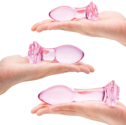 All good things come in threes. Anal training has never looked so good with these beautiful rose-shaped butt plugs by Glas! These beautiful rose-shaped plugs are made of smooth body-safe glass and feature a tapered tip for easy insertion. With a flared rose shaped base, you can wear it to slowly train yourself to enjoy the exciting full feeling from wearing a plug. This set makes the perfect gift for your partner or yourself! Glass toys are a great option for anal toys as they’re easy-to-clean completely body-safe and versatile! Experiment with temperature play by gently warming the glass toys in warm water or chilling them in the refrigerator for thrilling new sensations when using! Smallest plug is 3 inches, medium is 3.5 inches and largest is 4 inches.