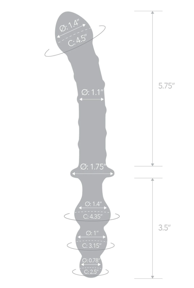 Versatile, curved and double ended! The Twister Dual-Ended glass Dildo is perfect for beginners and experienced users alike. One end features a bulbous tipped dildo that has a ribbed blue texture around the shaft, while the other end features a beaded butt plug perfect for anal stimulation beads. Both ends are tapered for easy insertion and features a flared middle between both ends to make it safe for anal play! Glas products are easy-to-clean, body-safe and versatile. Experiment with temperature play, gently warm the glass using warm water or chill it in the refrigerator for exciting new sensations. This double ended dildo is 10 inches in length and is perfect for solo play or couples fun!