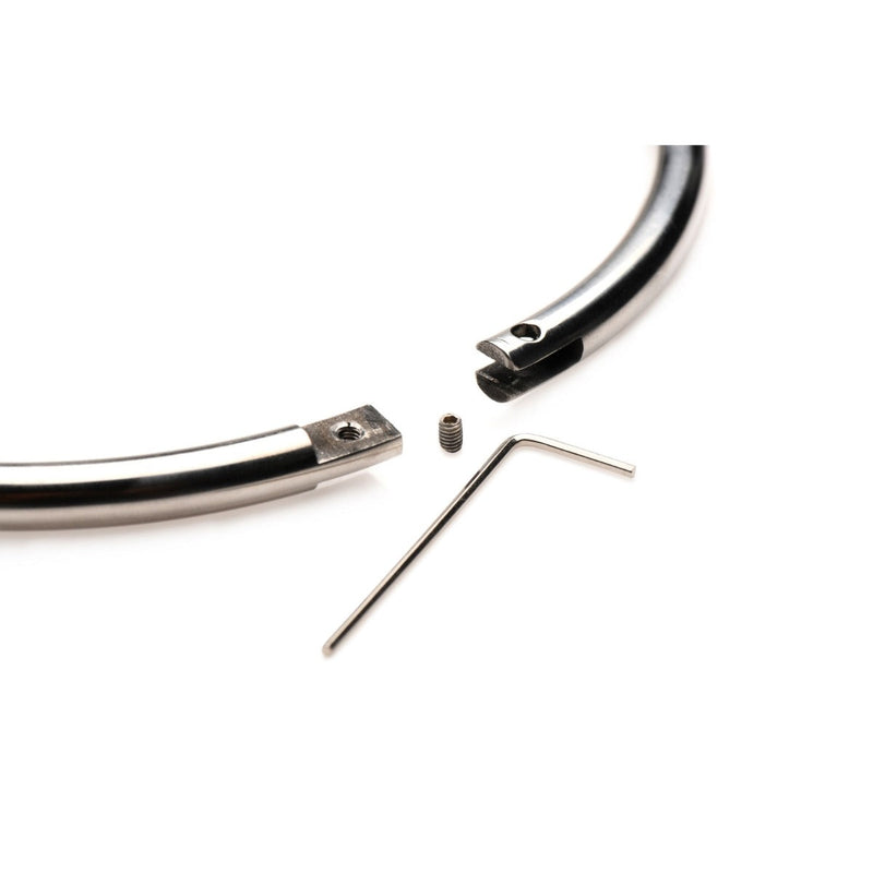 Make your submissive status obvious to your kinky friends and partners with a Stainless-Steel Locking Collar from Master Series! Wear it for short scenes or for long term wear such as weeks or months at a time! Made from durable, strong, and nickel-free stainless steel, it's easy to clean and perfect for sensitive skin types. This elegant collar locks into play and will stay on until you are released, wear it with all your favourite outfits day and night. Enjoy the weight and feel of the metal on your skin and let it be a constant reminder of your dominant/submissive relationship. Style it with additional accessories for an elevated edgy look. The locking mechanism works with a hex-key that is included, once locked up there’s no getting free without the permission of your dominant lover.
