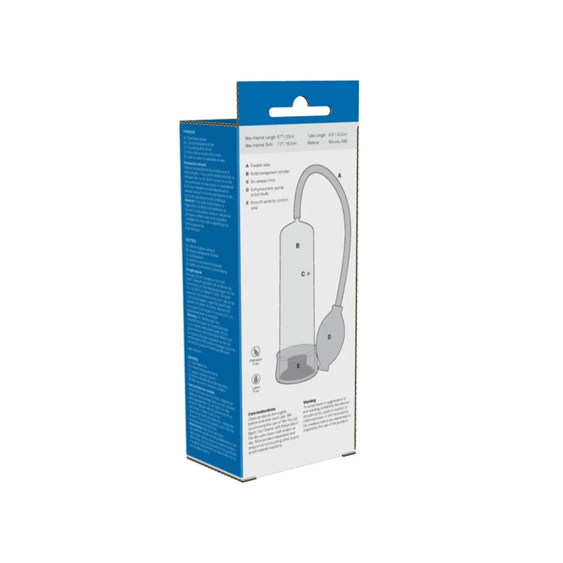 This penis pump has a solid transparent cylinder and a soft pneumatic pump action bulb that is easily squeezed to create suction and growth. The flexible tube that connects the hand pump to the cylinder allows for comfortable movement. The comfort seal is finished with smooth and stretchy TPE. This penis pump measures a maximum internal length of 19.5cm with a maximum internal girth of 15cm. The tube length measures 27cm, giving him plenty of flexibility. This pump is free from latex and phthalates and with regular use it delivers a larger size and improved blood flow that gives him better erections and more confidence in the bedroom.