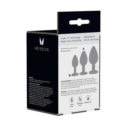 Take your pleasure to new heights with the Trio of Jewels butt plug set from Me You Us! This set of three silicone plugs is a great way to train you or your partner into the world of anal pleasure. Start off slow with the small plug, work your way up to the medium plug, and then experience a real intense stretch with the large plug. Each one of these plugs feature a tapered tip for easy insertion, and all three come with a bedazzling jewel-style base, making them ideal for showing off whilst using them. Stay slicked up with plenty of water-based lube for a wild ride, because Anal 101 is now in session!