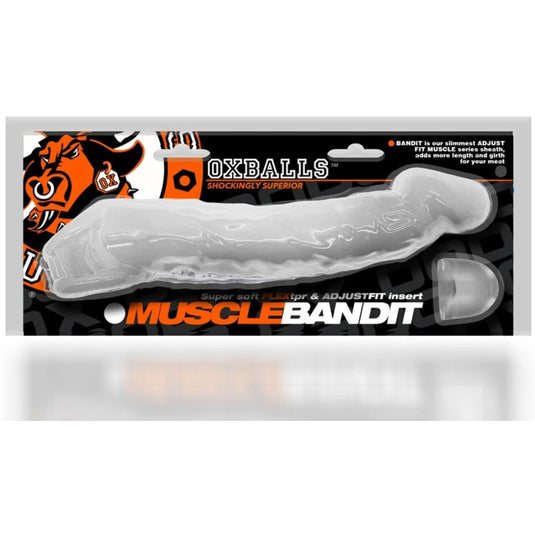 The Muscle Bandit by Oxballs is the slimmest of three “Muscle” cock sheaths: original Muscle is thick and long, Muscle Ripped is long and veiny and a bit slimmer, this Muscle Bandit is even slimmer and a bit short to add more to what you have, just not too much more. Elevate your shaft and add a little more girth and a few more inches of length with this cock sheath, made of a thick rubbery flexTPR its rubbery but firm enough for fast and hard play! This cock sheath comes with a soft bullet insert so you can custom fit to your shaft size. The Muscle Bandit suctions down on your shaft to jack you while you tug or fuck with it, the pleasure is just for the receiver with this cock sheath. Using lube, you can slide in whiles squeezing the shaft, so it sucks you in, then stretch the ball hole and drop your nuts through.