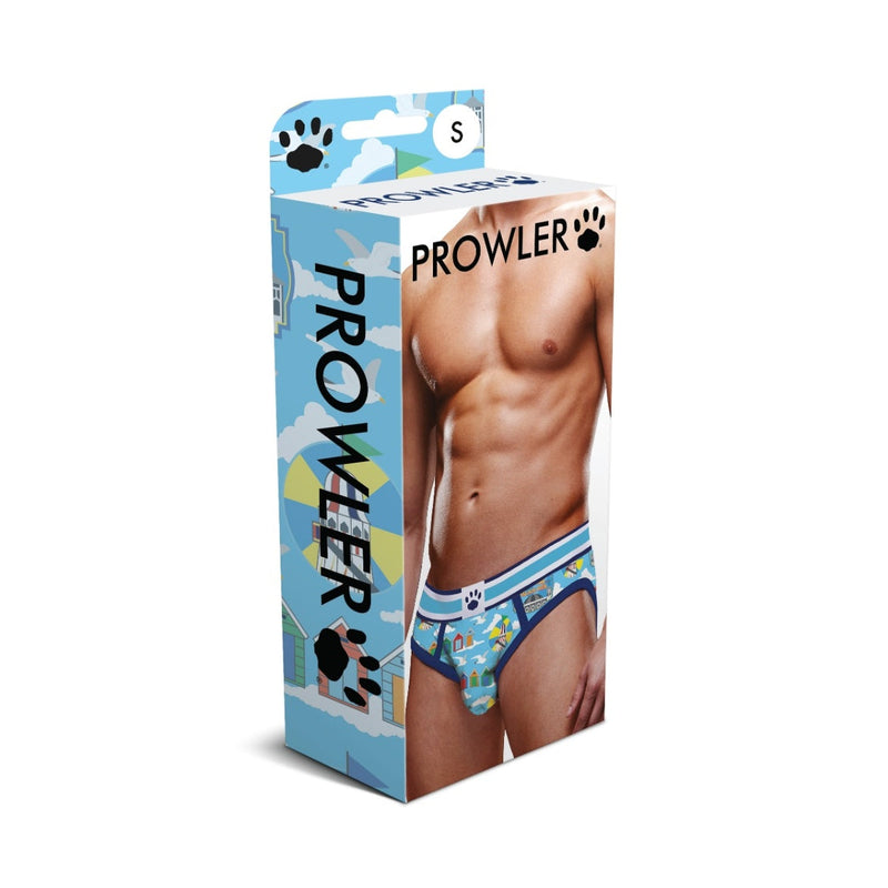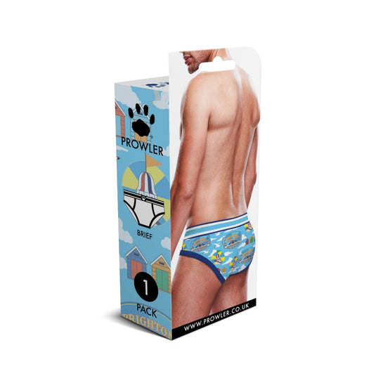 Keep that feeling of the seaside alive all year round with the Prowler Brighton Brief! A favourite destination for living and partying in the gay community, Brighton remains one of the UK’s most beautiful seaside destinations. The spirit of Brighton is captured perfectly in these cute briefs. Made from 92% polyester and 8% spandex, the waistband is styled with blue, white and aqua stripes, with the classic blue Prowler Paw logo in the middle. The blue leg piping gives the brief a fitted cut, and the body is designed with all of Brighton’s best features, such as the famous pier, beach huts, fluffy clouds and blue skies. This brief is the perfect addition to your underwear collection!