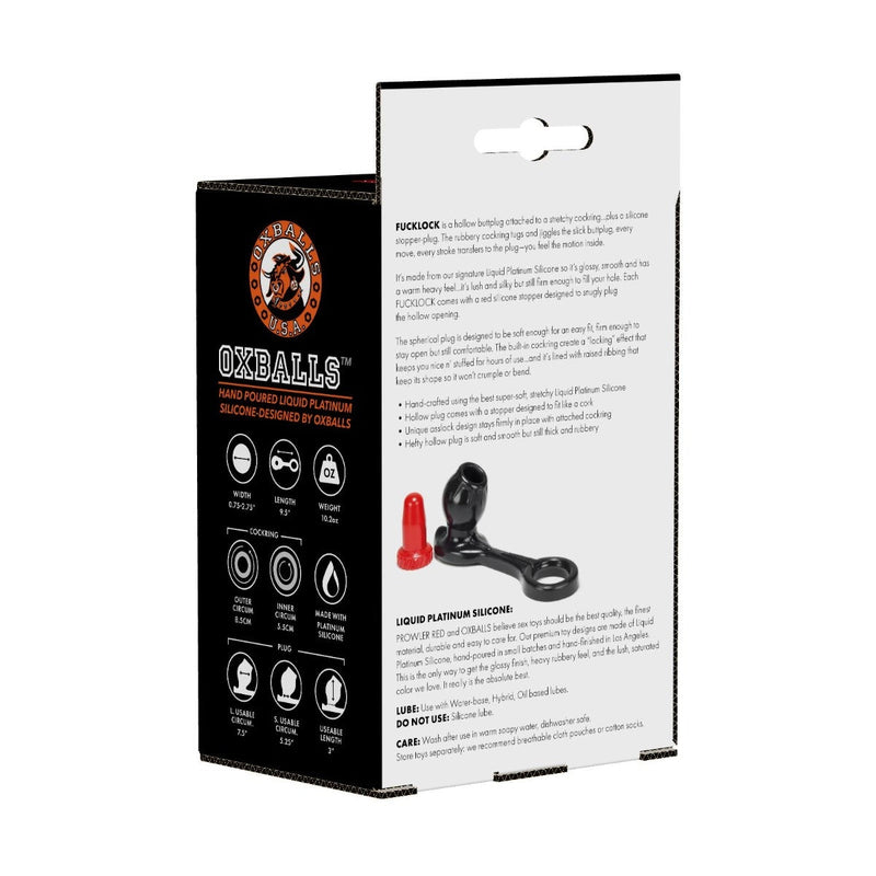 FUCK LOCK is a hollow butt plug attached to a stretchy cock ring…plus a silicone stopper-plug. The rubbery cock ring tugs and jiggles the slick butt plug, every move, every stroke transfers to the plug—you feel the motion inside.