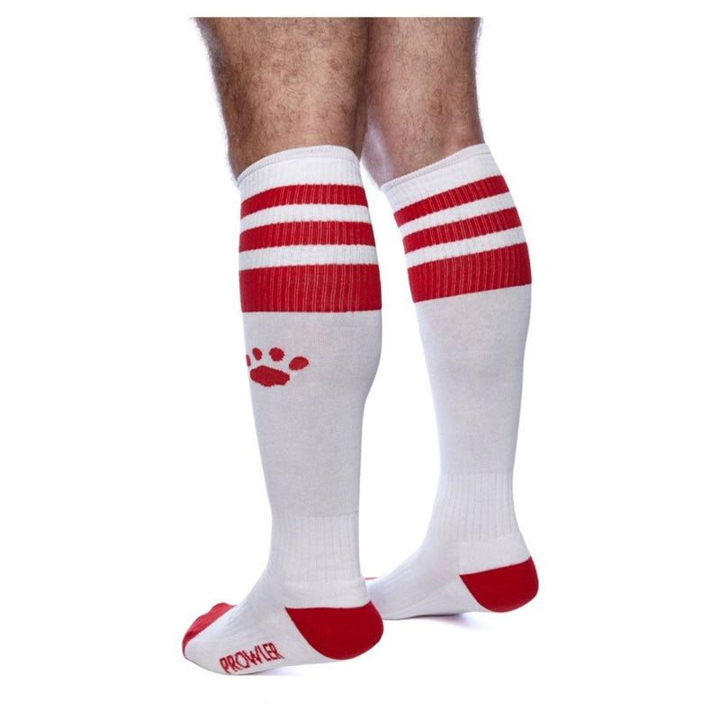 Football socks are a kinky fetish for guys who like the rough and ready thought of sportsmen, and these socks have been designed to look both authentic and fetish inspired. Made from soft material, these socks can ride up to the knee and feature three coloured stripes at the top, as well as the Prowler Paw logo just below them. You can choose from black & red, red & black & white and red for a sporty, masculine look.