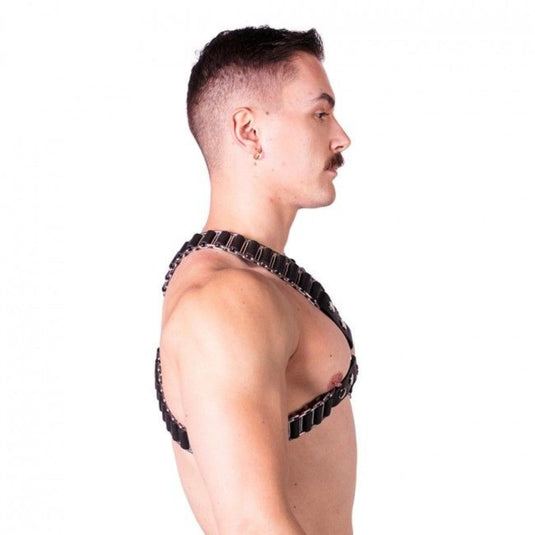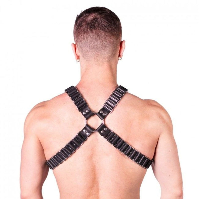 The Prowler RED Ballistic Harness is a striking piece which screams fetish role play and dungeon games. The X design with central ring and metal-work details create an eye-catching and practical harness. Featuring adjustable metal buckle straps and made from quality leather. Perfect to wear at your favourite fetish night.