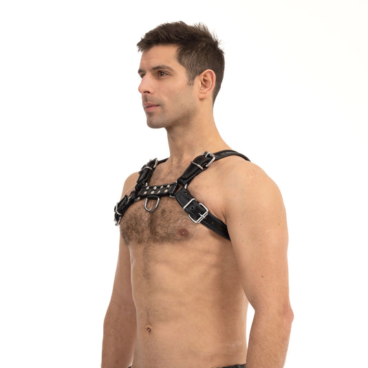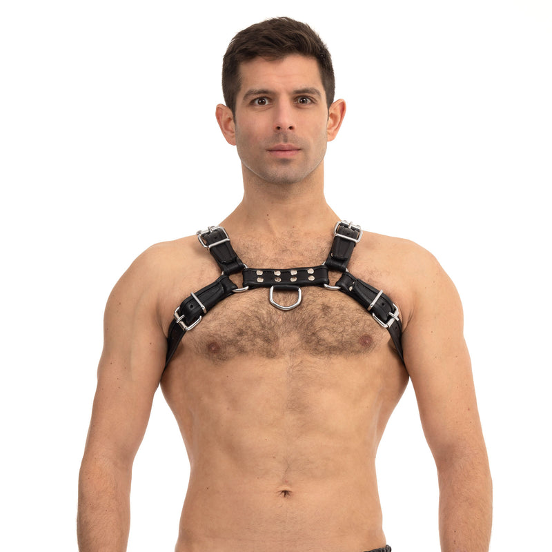 We all know that many fetish fantasies contain a sexy sort of pain, but to get the most out of your role-play, your clothing needs to be comfortable. Our Prowler RED Leather Bull Harness has adjustable metal buckle straps that can move to fit your shape. There is no doubt that your strong chest will be something to admire when you strap the harness on.