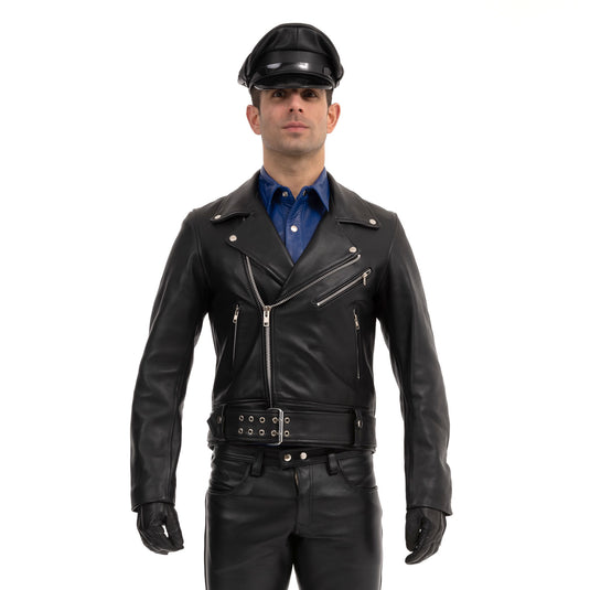 Get that classic fetish look with this high quality police jacket from Prowler RED. Made from the highest quality hides, this jacket is tailored to give you a sexy leatherman look when you wear it. The front pocket details are finished with shiny silver zips, and there is an adjustable belt at the bottom to give your desired finished look. This jacket is inspired by those classic looks from yesteryear that remain timeless, and looks hot as hell when worn!