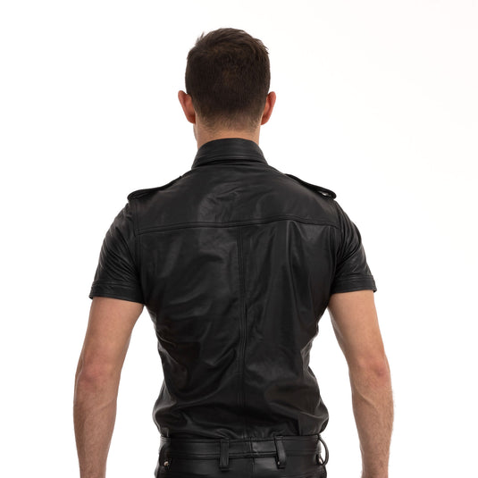 The Prowler RED range leather police shirt is a sharply tailored garment, made from quality leather. All black or available in black with grey or red piping details.