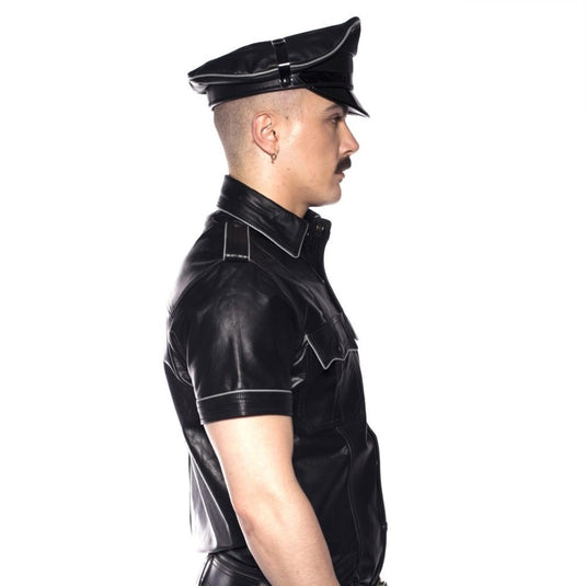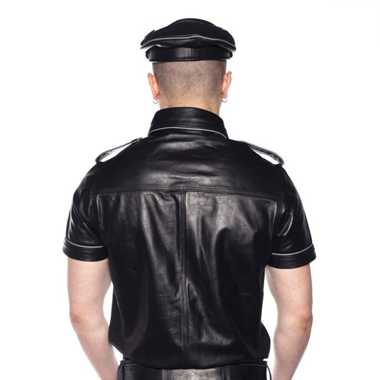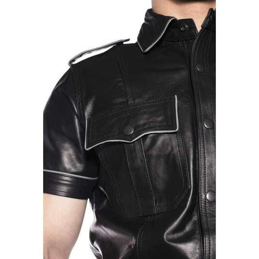 The Prowler RED range leather police shirt is a sharply tailored garment, made from quality leather. All black or available in black with grey or red piping details.