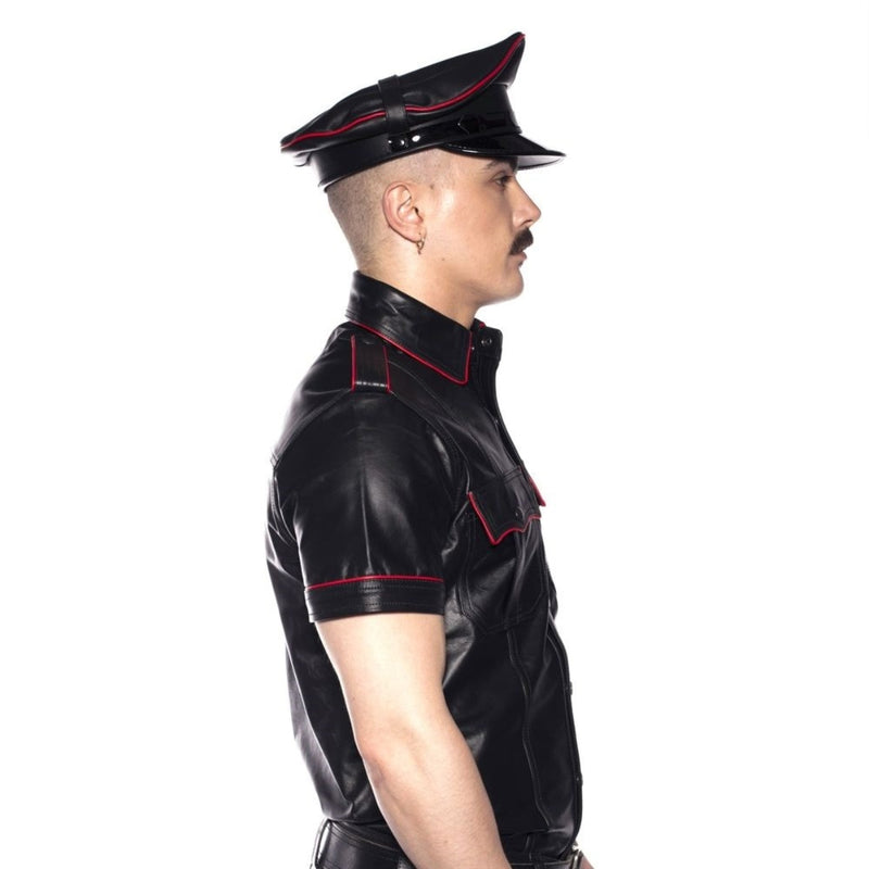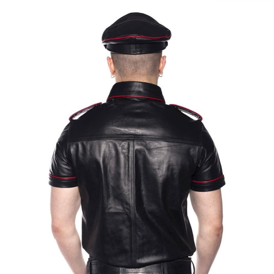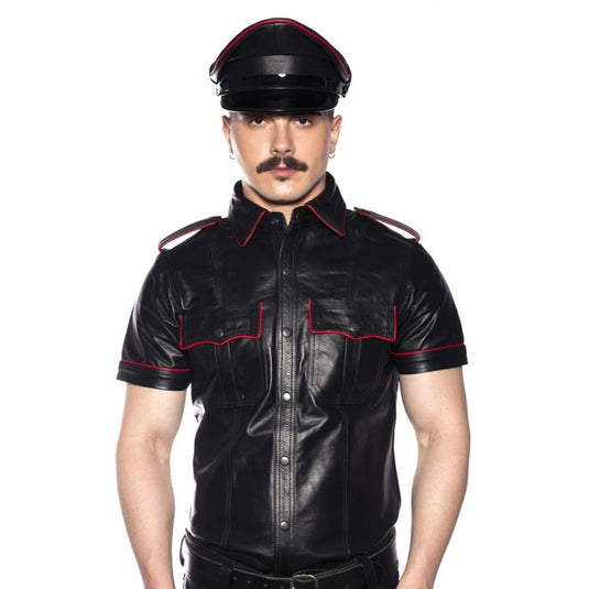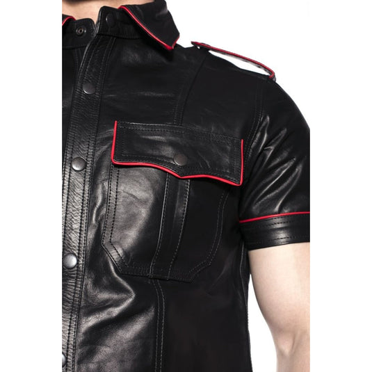 The Prowler RED range leather police shirt is a sharply tailored garment, made from quality leather. All black or available in black with grey or red piping details.