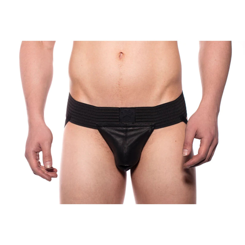 Features: Leather pouch - Thick, comfortable elastic waistband - Classic Black Butt Straps.