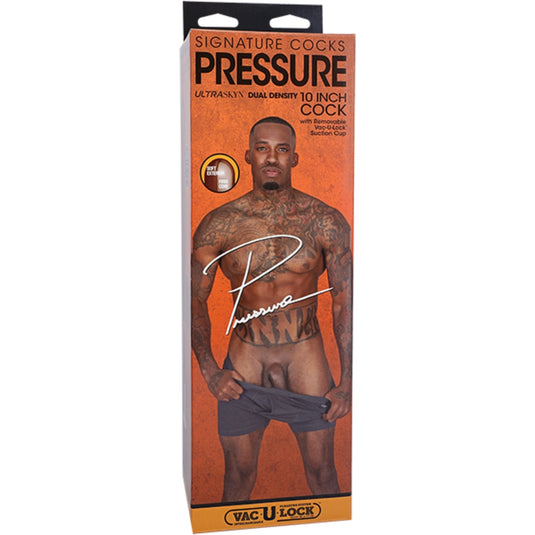 Pressure's Signature Cock is molded directly from his body and handcrafted in dual density Ultraskyn, with lifelike veins and curves for the ultimate porn star experience. This material perfectly captures every detail, mimics the unique feel of real skin, and warms to body temperature with use.
