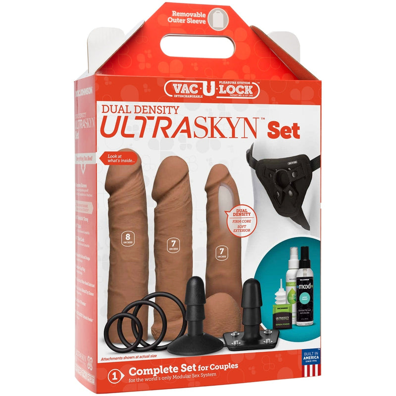 The Vac-U-Lock Dual Density Ultraskyn Set is a solid investment for upgrading or beginning your strap-on accessories collection, offering multiple options in one box via a complete harness with removable o-rings and plug, three Ultraskyn attachments, and a bottle of Mood water-based lube. These lifelike dual density attachments—an 8” Realistic Dong, a 7” Cock, and the bestselling 7” Slim Cock-- warm to body temperature with use and feature a soft, pliable exterior that gives way to a firm inner core, recreating the feel of a real erect penis.
