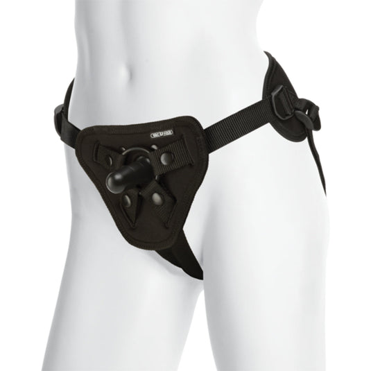 The Supreme Harness is built for comfort and rigorous play. It provides sexy support and is easily adjustable up to 60 inches, with pull-to-tighten straps, open crotch and rear, and a snap front for swapping out attachments. Made of smooth Black neoprene, the Supreme harness works with all Vac-U-Lock attachments as well as strap-on compatible toys. Includes two O-rings.