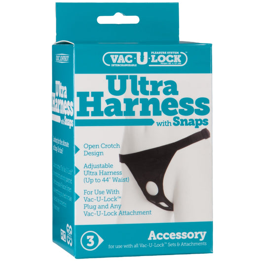 Introducing Doc Johnson's Ultra Harness With Snaps. This harness has an adjustable waist up to 53 inches, an open crotch for maximum comfort, easy access, and non-slip action all designed to give you command and control for your erotic pleasures. The opening under the plug is high enough to allow the man's penis to hang below. Just add your favorite Doc Johnson Vac-U-Lock attachment and you're ready to go!